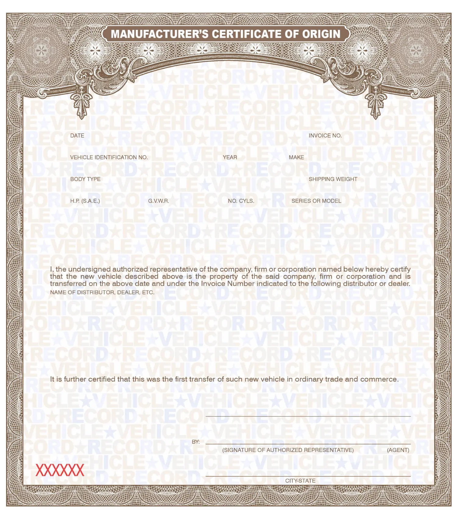 You can order blank manufacturer certificate of origin’s ready to be imprinted by you. Our MCO’s are produced using premium security paper supplied as 8.5″ x 11″ standard letter size. The actual MCO certificate is approximately 7″ x 8″ on the letter sheet using micro-perforations to be seperated. These MCO’s will have all the same approved background print, paper, and security features and ready to be printed according to your template or you can purchase our template. We offer these with or without a control number but unfortunately, the control number is set during production and thus we cannot accept custom numbering requests on the blanks. To keep our prices low our control number color is also a factory option between red or black. If you need a particular color please check with us first to confirm which we are running.